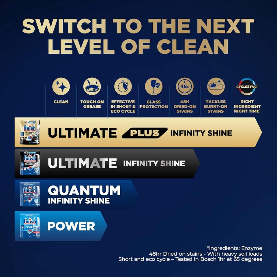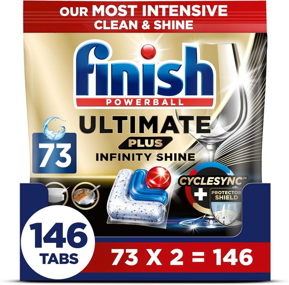 Pastillas para Lavavajillas Finish, Ultimate Plus Infinity Shine, 146 Unidades (73 x 2 Paquetes), Aroma Fresco, Elimina la Grasa Difícil