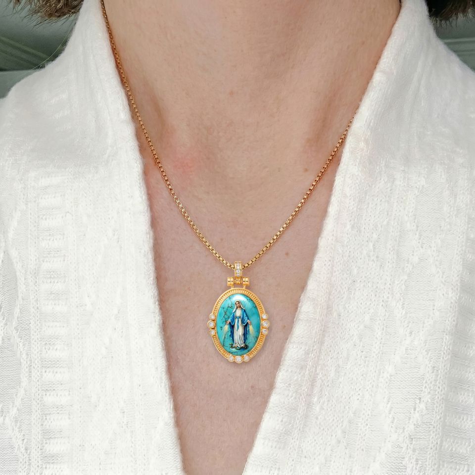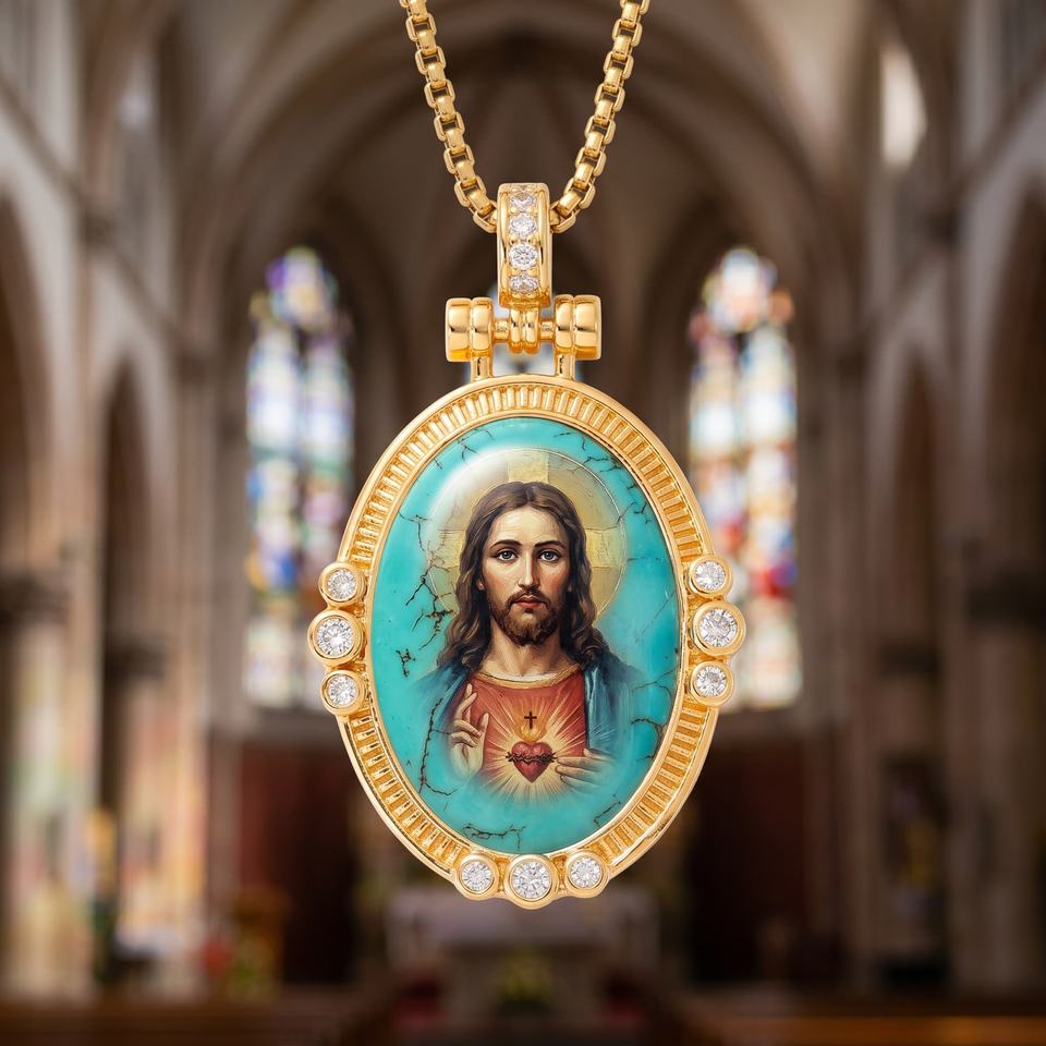 Collar de devoción cristiana con colgante religioso de Jesucristo en esmalte turquesa, núcleo intercambiable, regalo de Primera Comunión