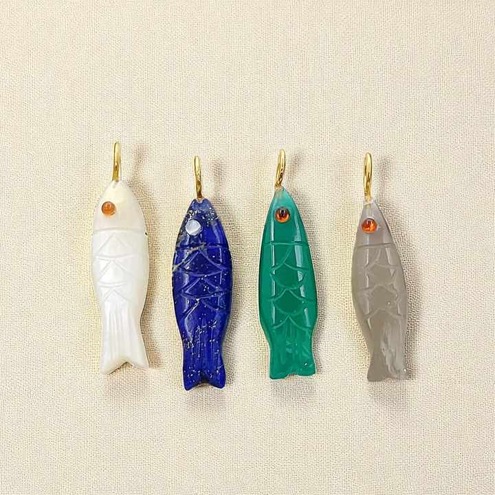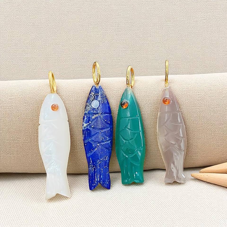 Amuletos colgantes tallados en peces con piedras preciosas naturales