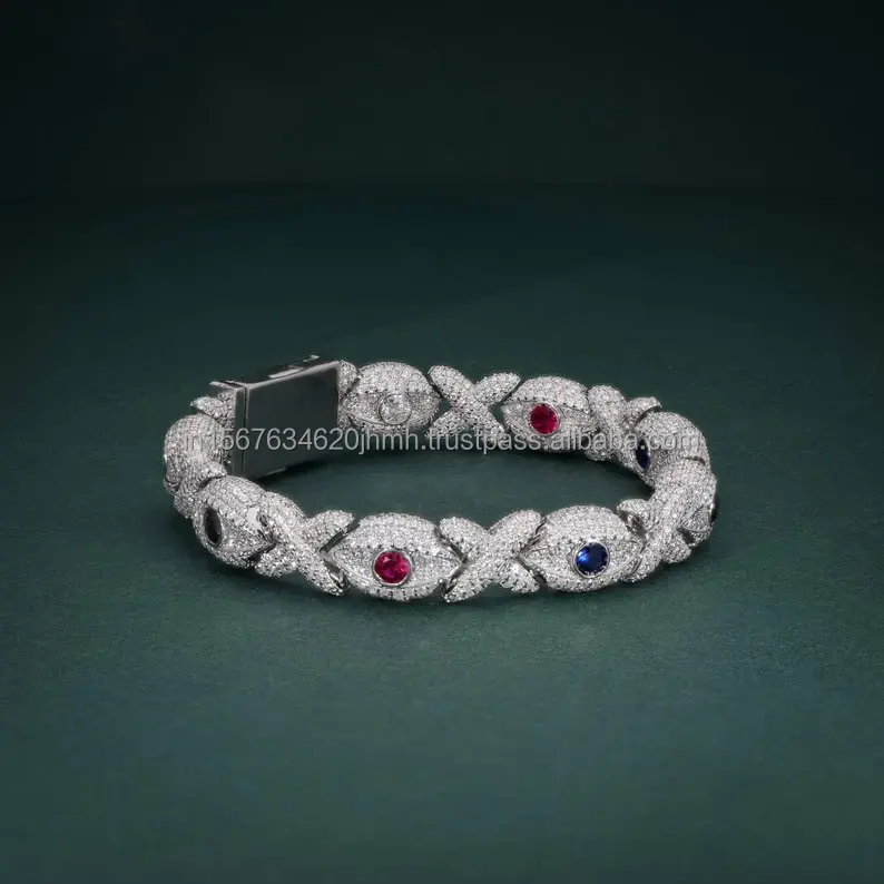 Pulsera de Diamantes Cultivados en Laboratorio Estilo Pescado con Rubíes y Zafiros, Pulsera de Eslabones de Lujo con Incrustaciones de Piedras, Aspecto Elegante y Exquisito