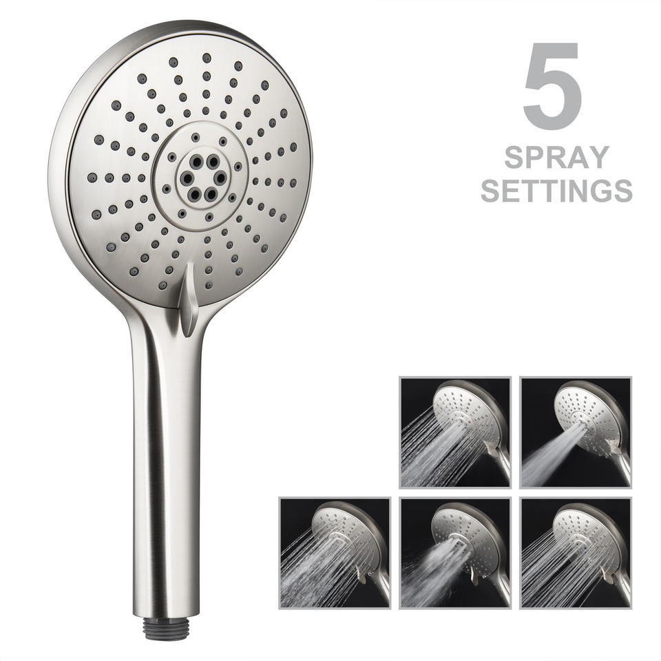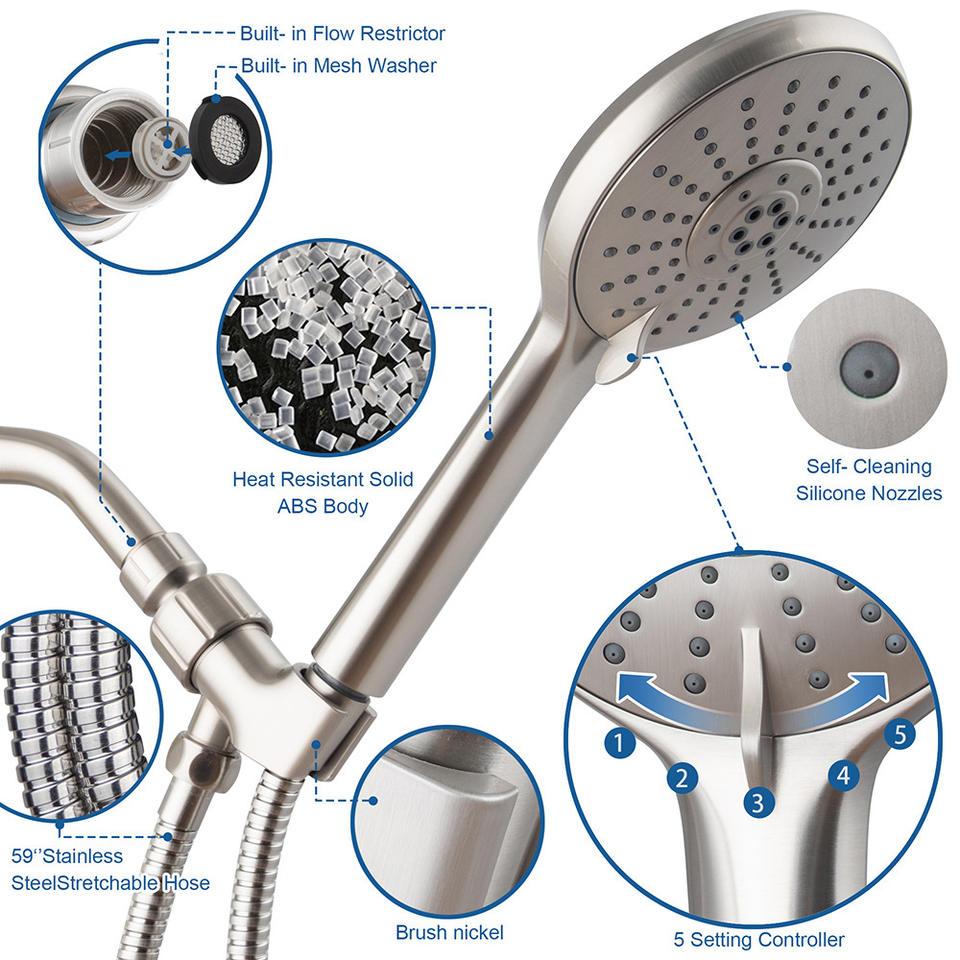 Juego de cabezal de ducha de cinco funciones con manguera de 59 pulgadas, níquel cepillado, boquillas autolimpiantes, masaje y rociador de lluvia