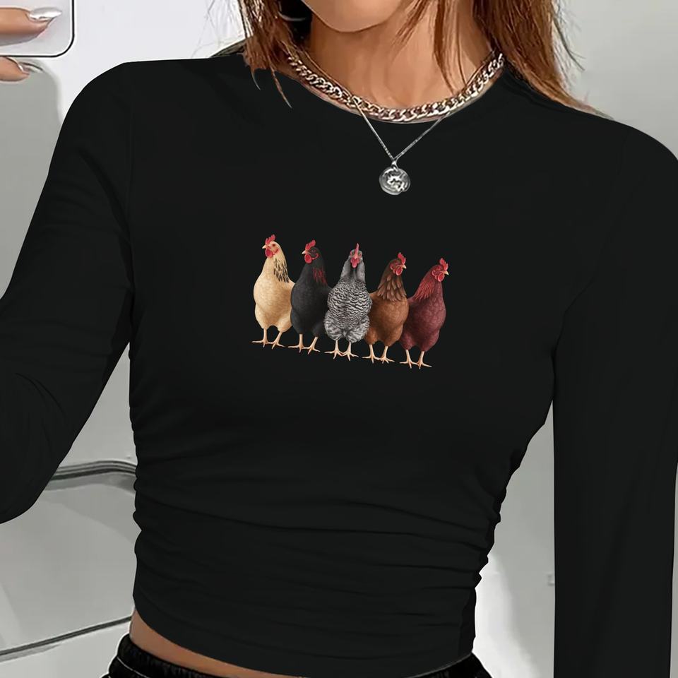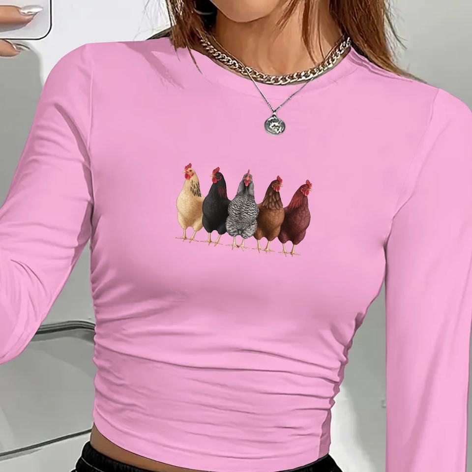 Cinco pollos coloridos en una fila camisa de manga larga de moda para mujer