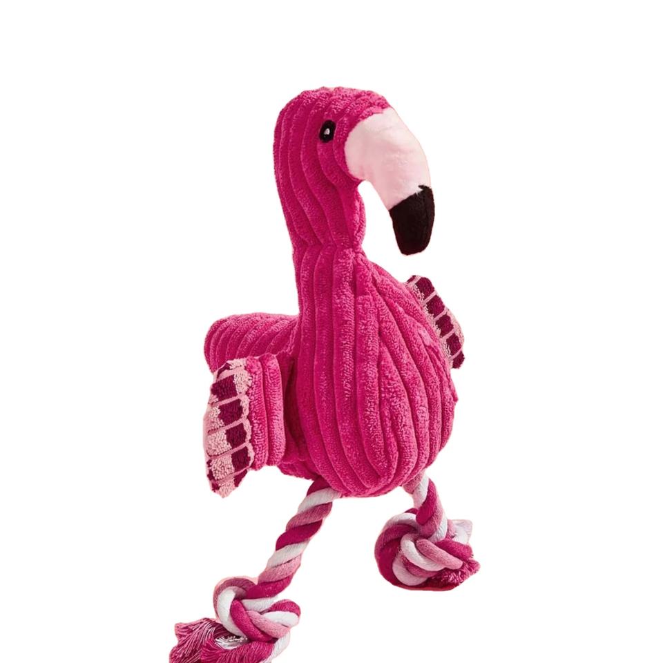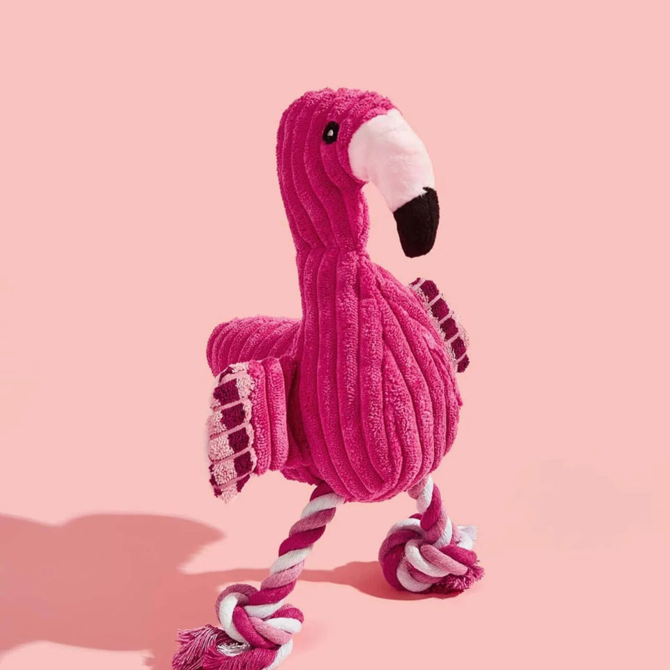 Flamingo Squeaky Rope Dog Toy Ecológico Uso en interiores/exteriores Hecho de espuma de gamuza Esponja de lino Tamaño mediano Empaquetado en cartón