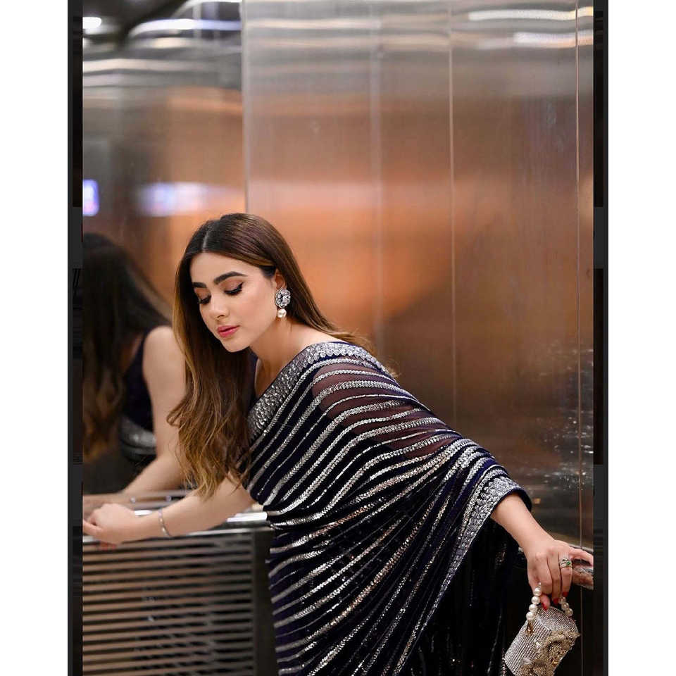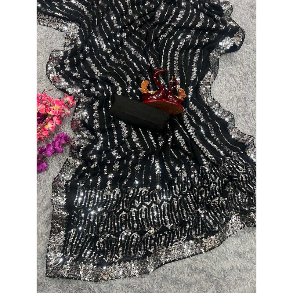 Sari acampanado con corte en A para fiestas, con bordado de lentejuelas y ribete de encaje