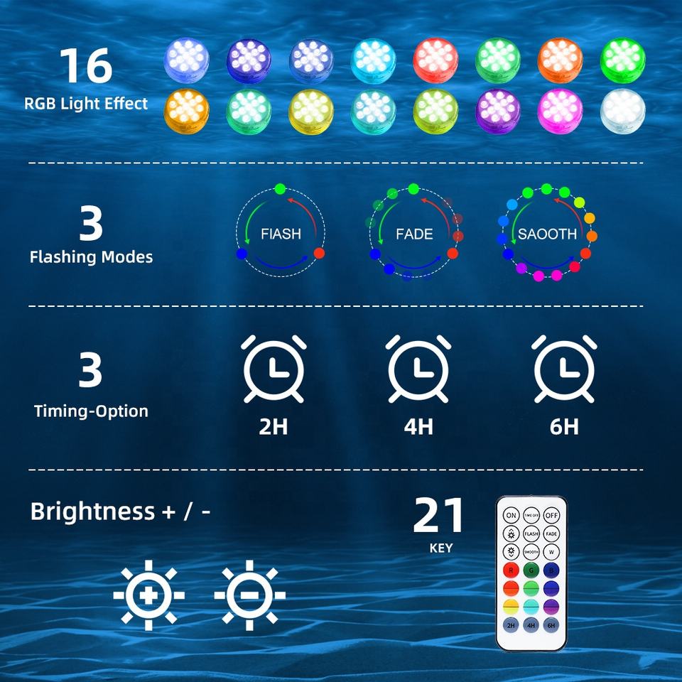 16 colores, 3 modos que destellan, amortiguador, contador de tiempo 2H/4H/6H