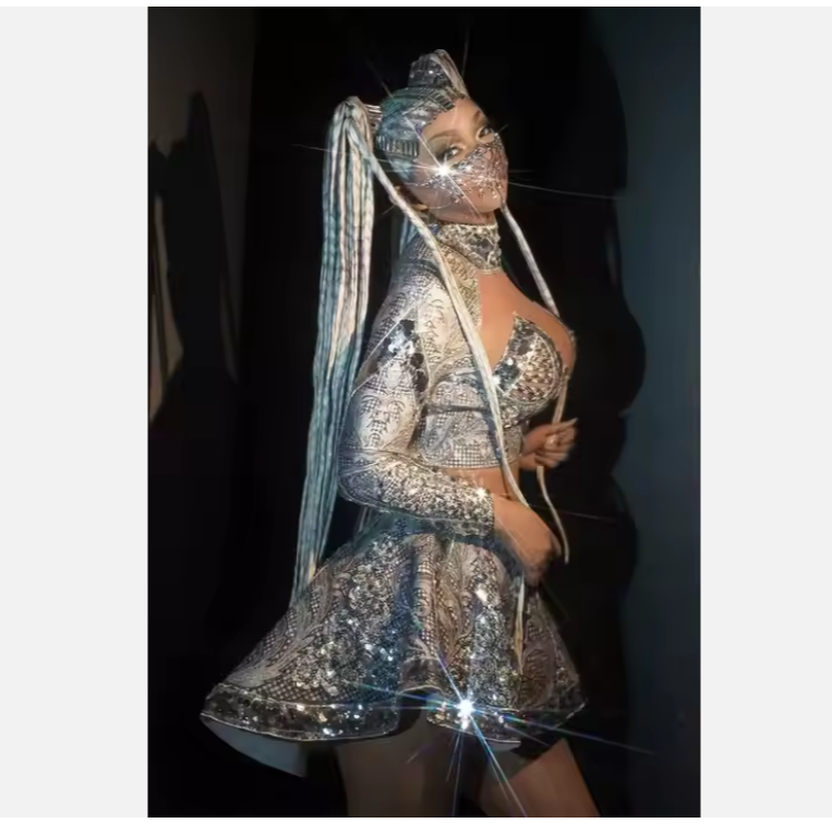 Camiseta de lentejuelas plateadas intermitentes Falda corta Ropa de graduación de cumpleaños Mujeres Bailarina DS Show Conjunto de atuendo novedoso