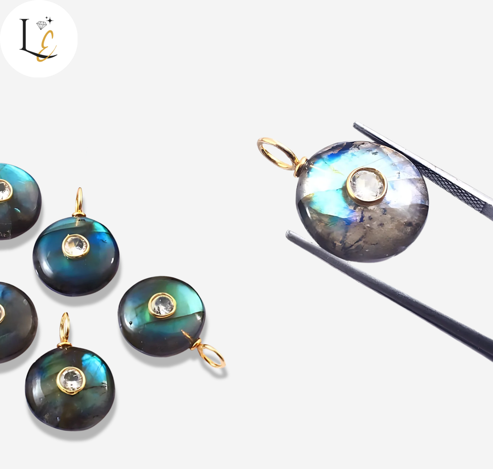 nombre o palabras:Colgante de piedras preciosas con incrustaciones de forma redonda de labradorita natural