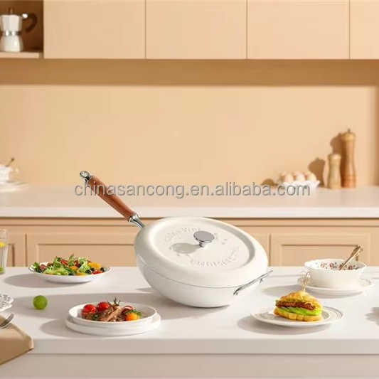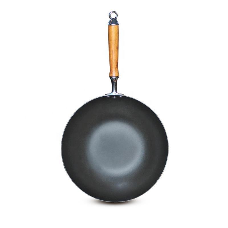 Sartén Wok de hierro esmaltado de fondo plano con tapa y mango de madera-Universal para inducción, eléctrica, horno, Artesanía no tóxica sin recubrimiento