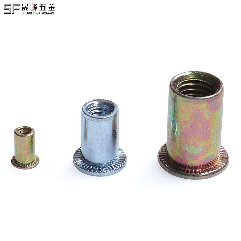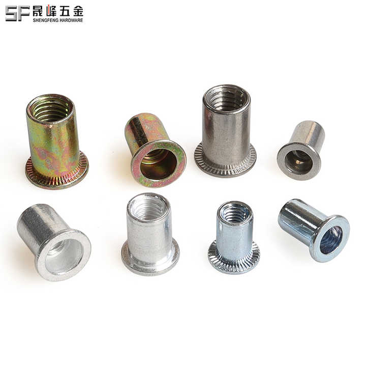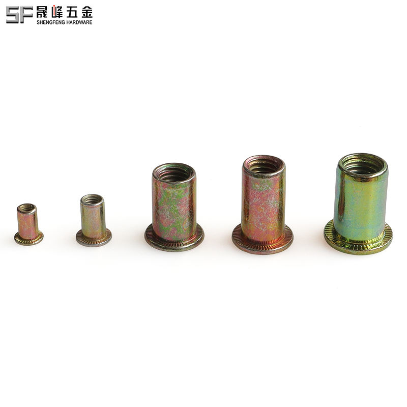 Tuercas remachables de cabeza plana y cuerpo liso con extremo abierto, de acero al carbono cincado, métricas/unidas M3M4M5M6M8M10M12 1/4'' 5/16'' 3/8'' 1/2''