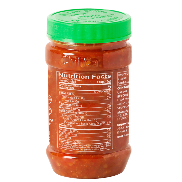 Ingredientes:Chili (86.9%), garlic (1%), rice vinegar