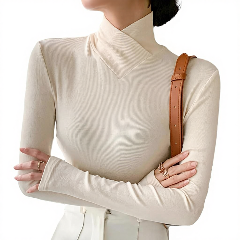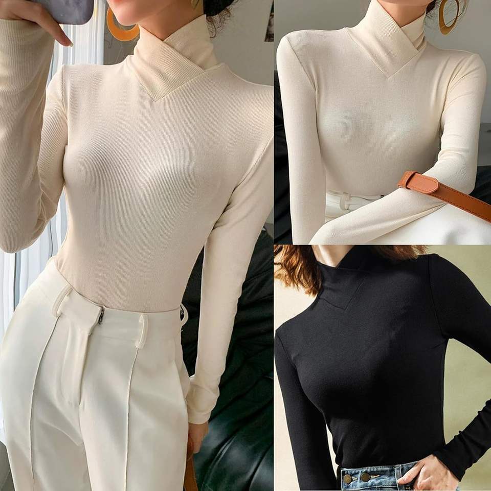 Suéter de Cuello Alto Cruzado de Felpa para Mujer, Cuello Alto Simulado Elástico, Manga Larga, Estilo Coreano