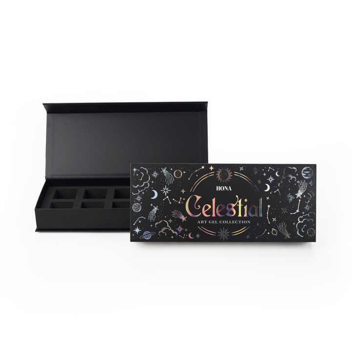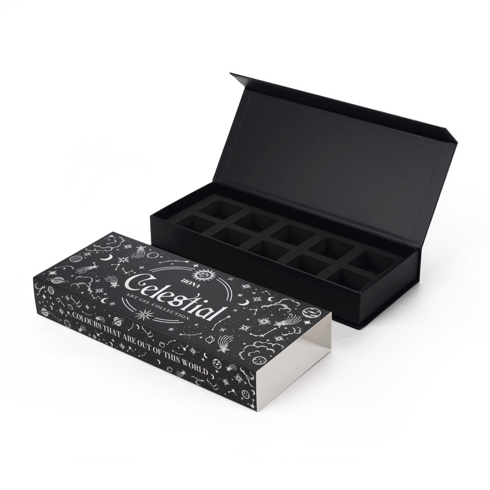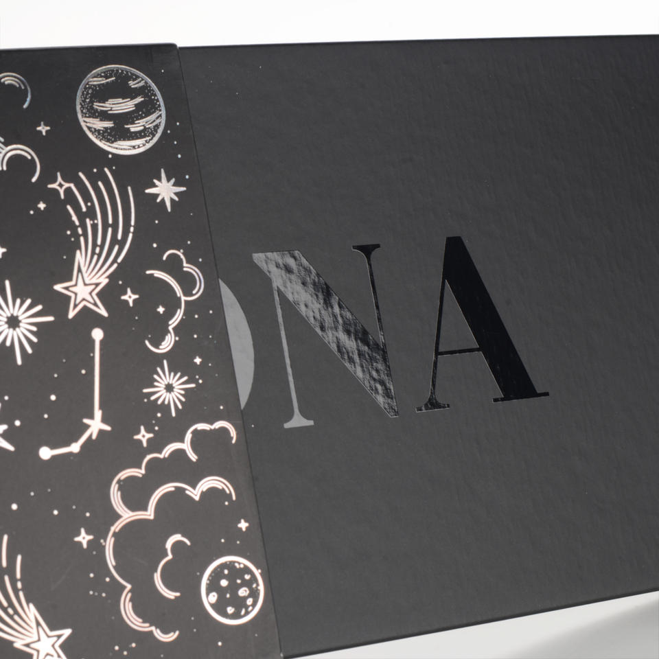 Caja de Regalo de Lujo con Forma de Libro Cosmético, de Cartón Negro y Papel Repujado con Iconos de Planetas de Dibujos Animados en Flexografía