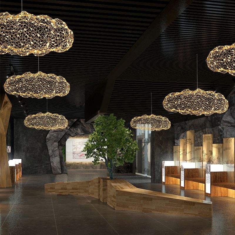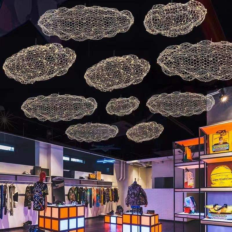 Nube flotante LED Candelabros y luces colgantes Malla de alambre creativa Forma de nubes Hotel Mall Sala de estar blanca Comedor de hierro