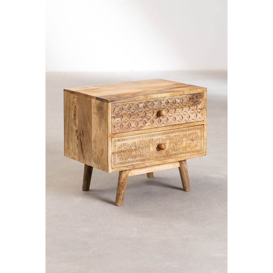 Mesita de noche de madera Flora Mango, elegante mesita de noche de madera maciza para almacenamiento de dormitorio y decoración moderna de muebles para el hogar