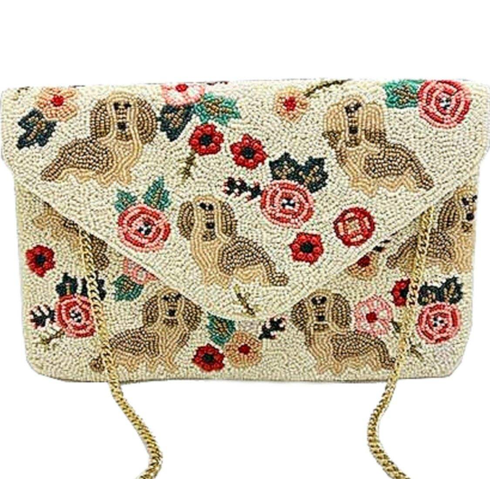 Bolso de Mano Tipo Clutch con Cadena Cruzada y Cuentas Florales para Amantes de los Perros, Bolso de Noche con Orejas Caídas de Cachorro de glowin fashion