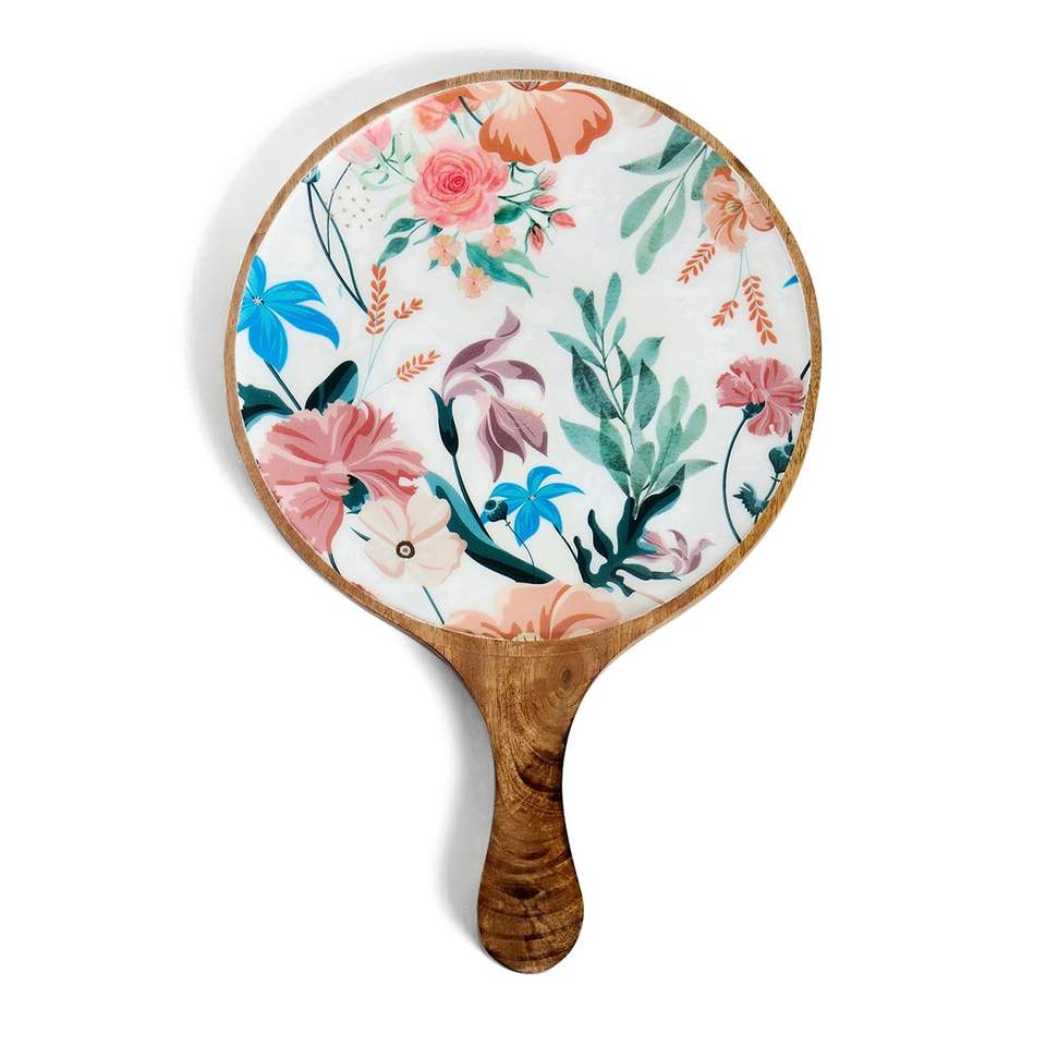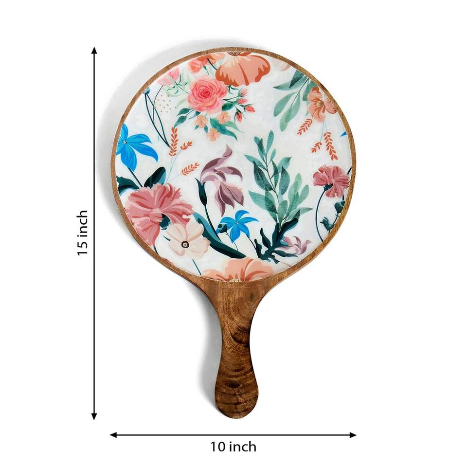 Bandeja Redonda de Madera de Mango con Diseño Floral y Recubrimiento de Esmalte, Ideal para Regalos, Hogar, Cocina y Desayuno