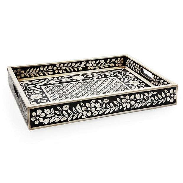 Bandeja con incrustaciones de hueso indio negro con patrón Floral para el hogar, Hotel, Motel, bandeja para servir, hecha a mano, incrustaciones de hueso con patrón Floral negro