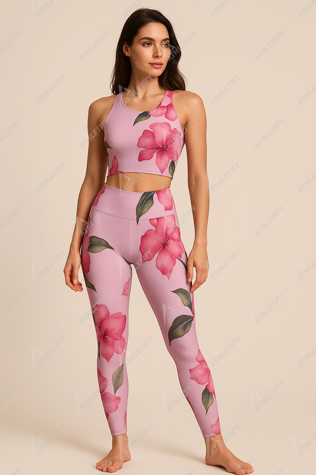 Conjunto de mallas de yoga con cintura elástica transpirable y ligera con estampado sublimado de patrón floral para estilos de vida activos
