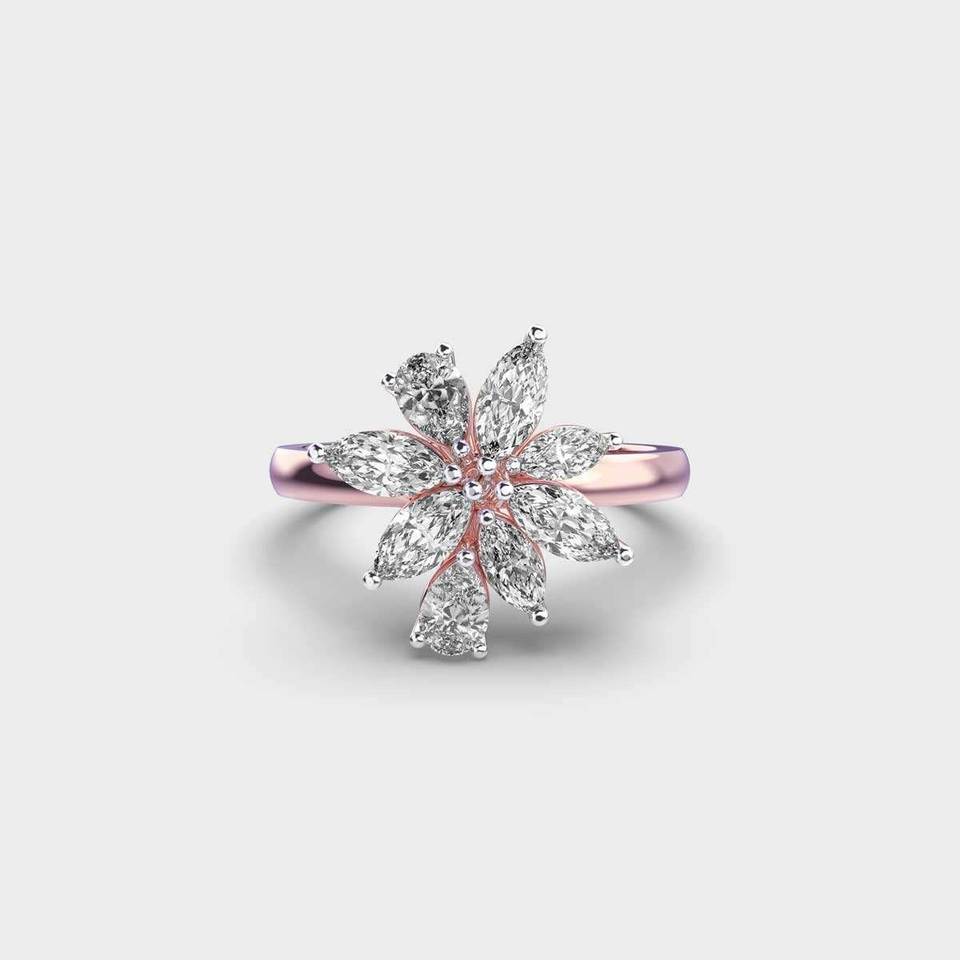 Anillo de Diamantes Cultivados en Laboratorio con Forma Floral, con Piedras de Corte Marquesa y Pera de 2.0 CTW, Anillo de Compromiso y Boda Único, Joyería Fina para Mujer