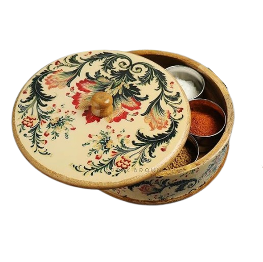 Pegatina Floral Diseño Impreso Tapa Hecha A Mano Madera Masala Dabba Hierbas Y Especias Caja Diseñador Cuchara para Cocina