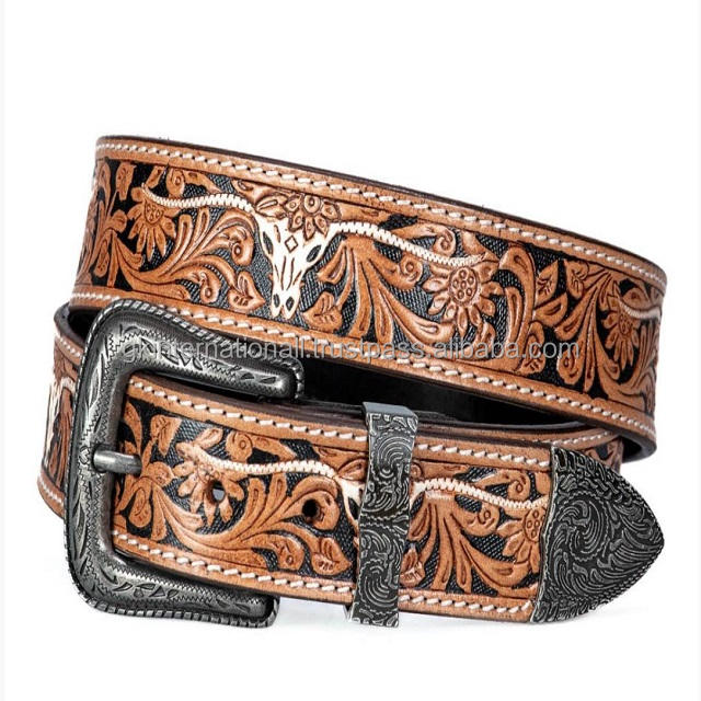 Cinturón de vaquero de cuero occidental tallado a mano y grabado floral con hebilla de latón antiguo de 3 piezas grabada floral