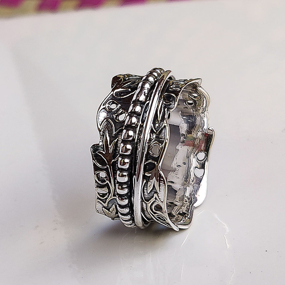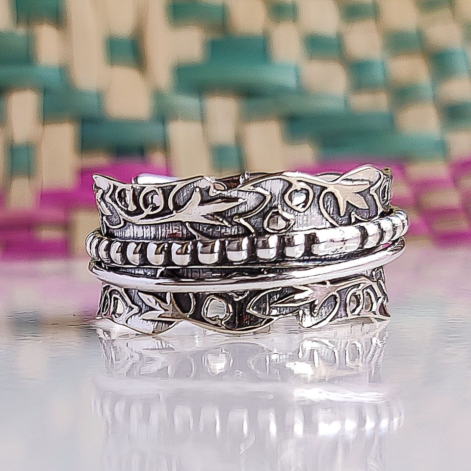 Anillo Giratorio Floral, Anillo Antiestrés Hecho a Mano, Joyería Boho, Anillo Giratorio de Meditación, Regalo para Ella