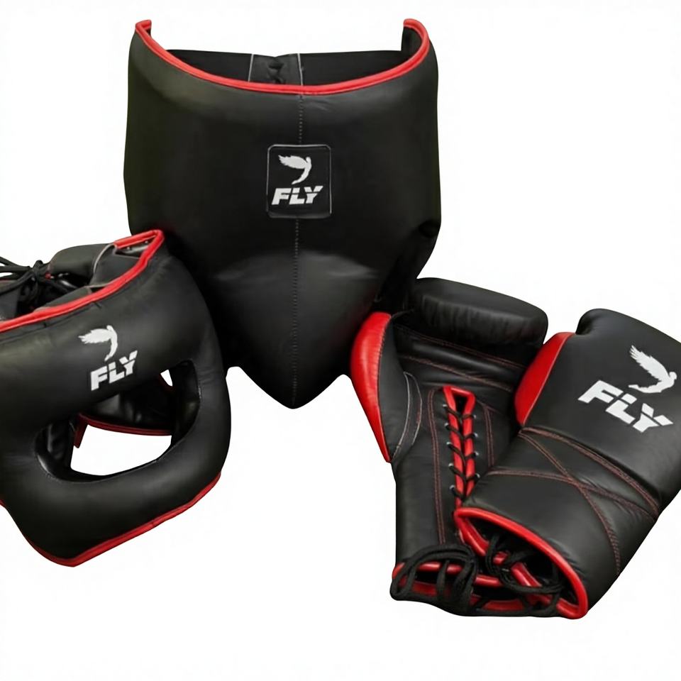 Set de Boxeo MMA Fly SuperLace | Protector de Cabeza y Protector Inguinal de Cuero Vacuno Genuino Personalizable para Boxeo