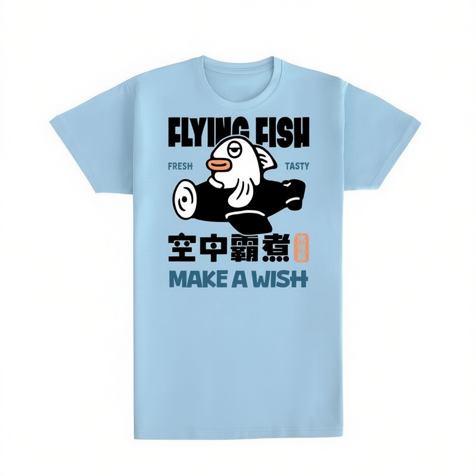 Camiseta Flying Fish Azul Claro con Estampado de Dibujos Animados, Cuello Redondo, Manga Corta, Unisex, Ropa Promocional