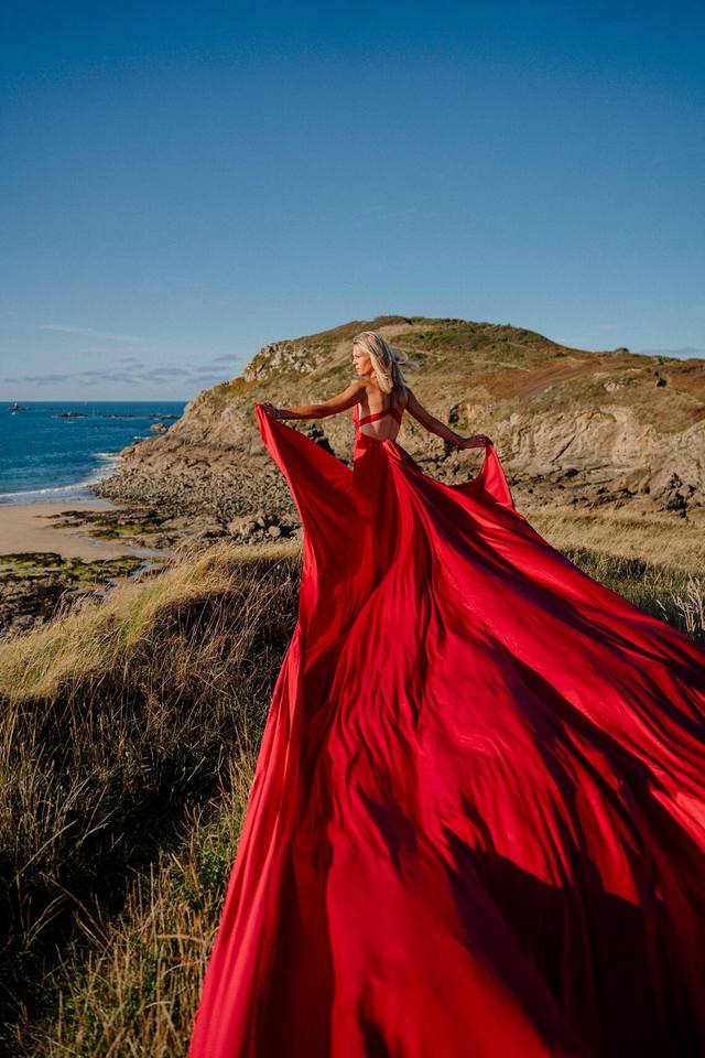 Vestido Largo de Satén Rojo para Sesión de Fotos, Vestido Flotante