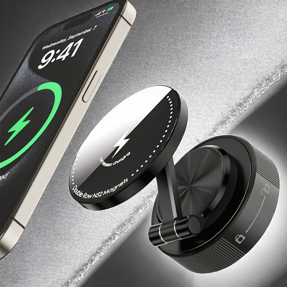Cargador Inalámbrico Plegable de 15W, Soporte Delgado para Teléfono con Ventosa para Coche, Imanes Fuertes, Altura Ajustable, para Uso en Tablero de Instrumentos o Escritorio