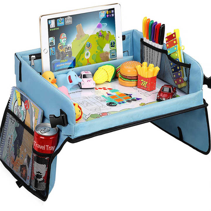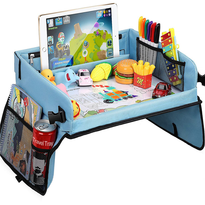 Cochecito de coche plegable con asiento trasero para niños, bandeja de viaje de almacenamiento esencial con tablero de borrado seco, mesa de asiento de coche, bandeja de viaje de escritorio