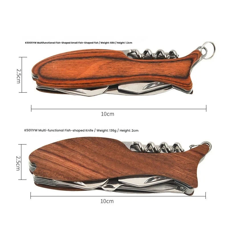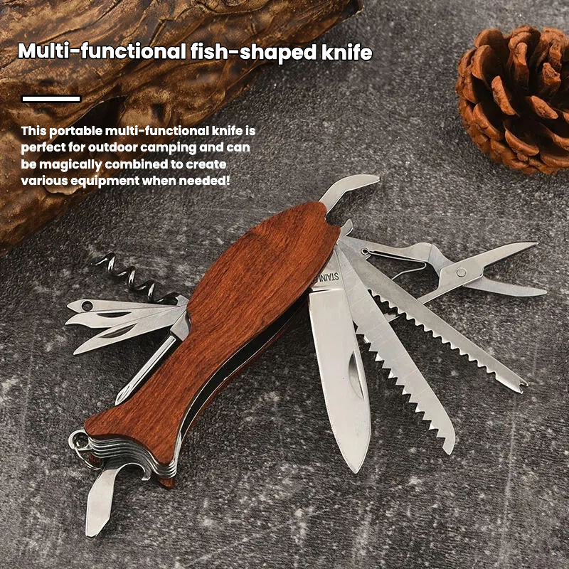 Navaja Plegable Multiusos para Exteriores, de Acero Inoxidable, con Forma de Pez y Mango de Madera