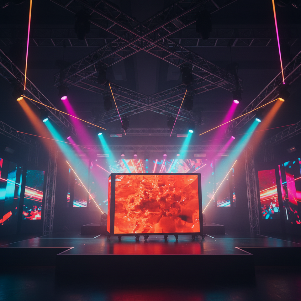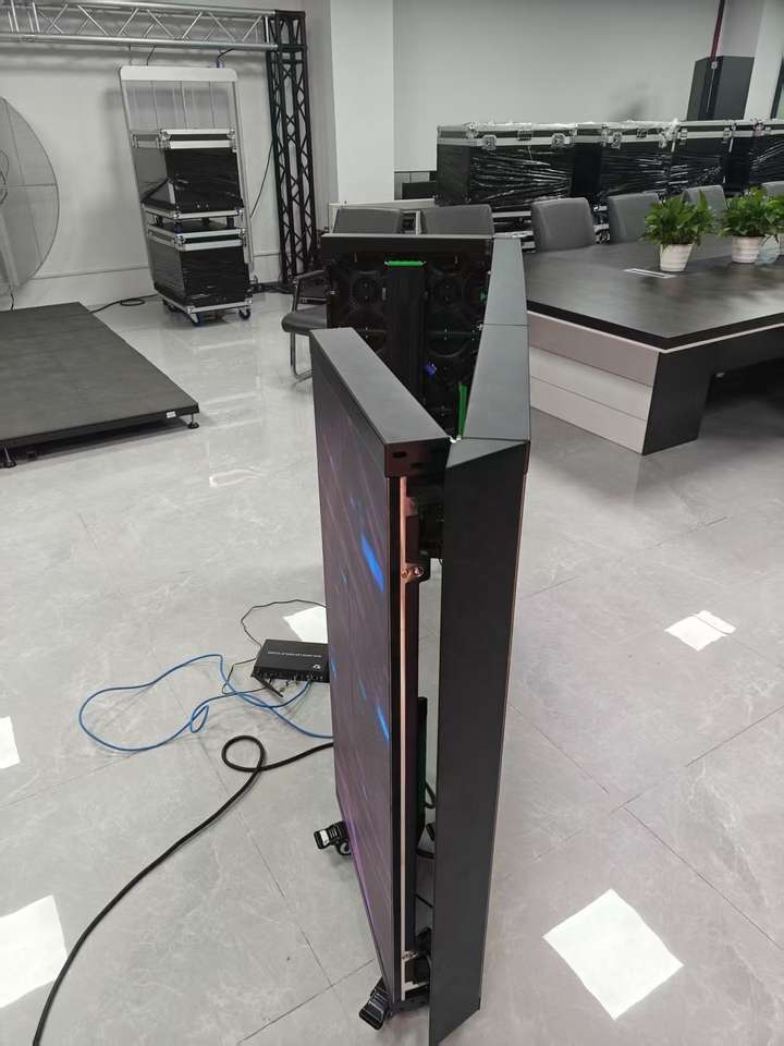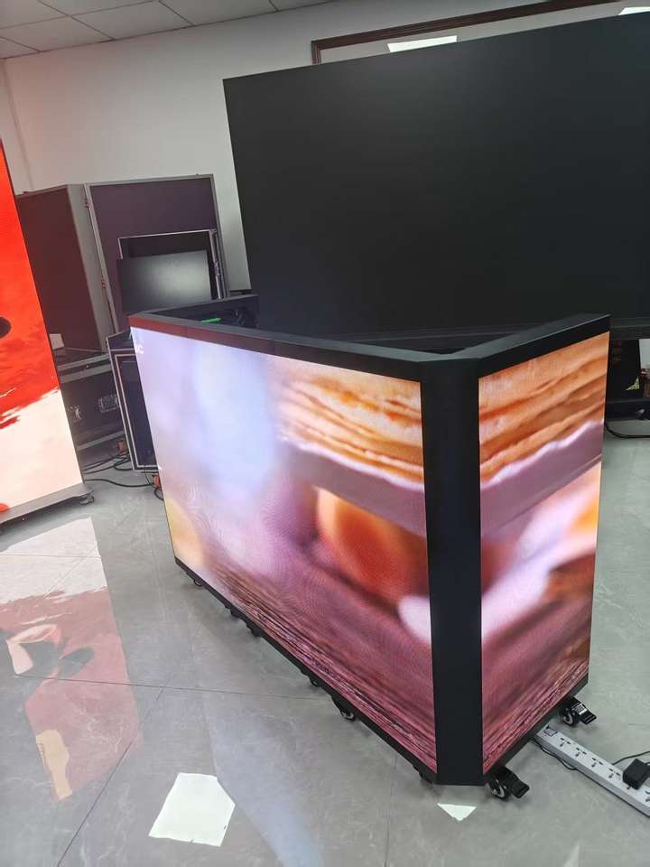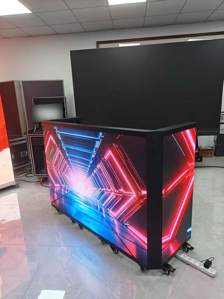 Pantalla LED plegable para DJ, con ruedas móviles y pantalla curva, ideal para festivales de música, bares y actuaciones en vivo.