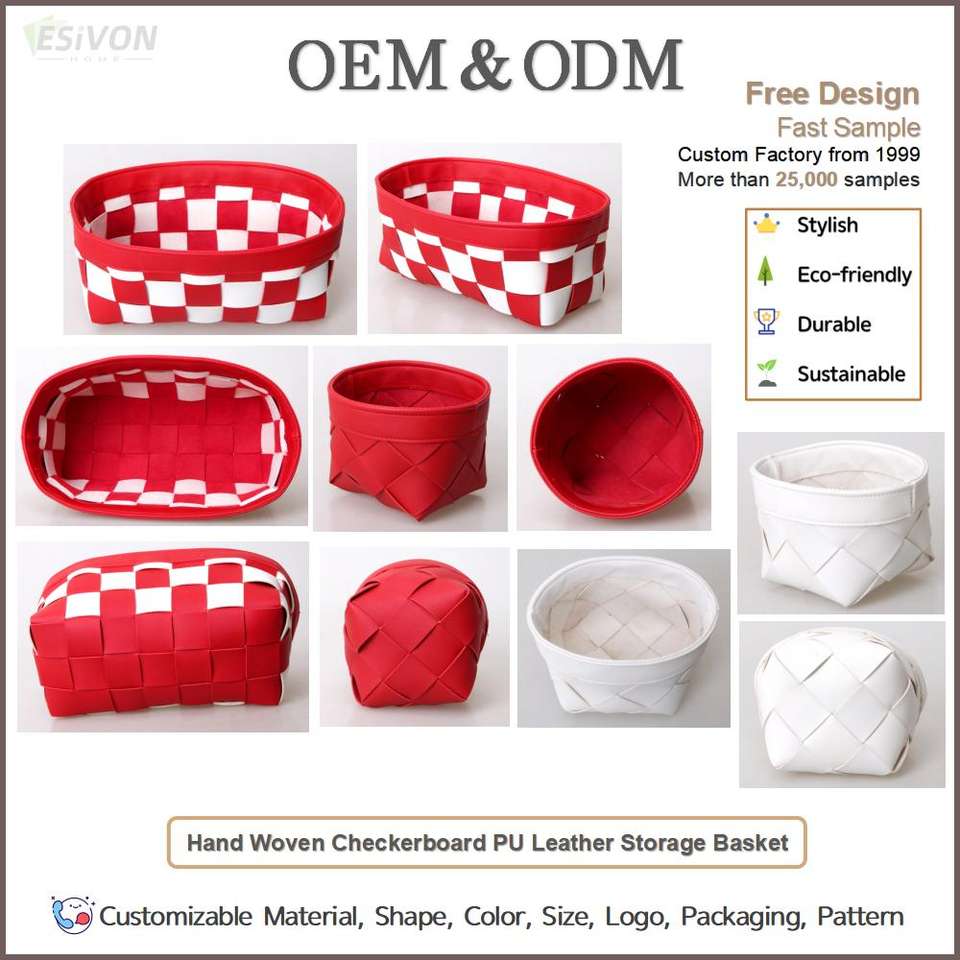 Cesta de almacenamiento de cuero PU con diseño de tablero de ajedrez tejida a mano
