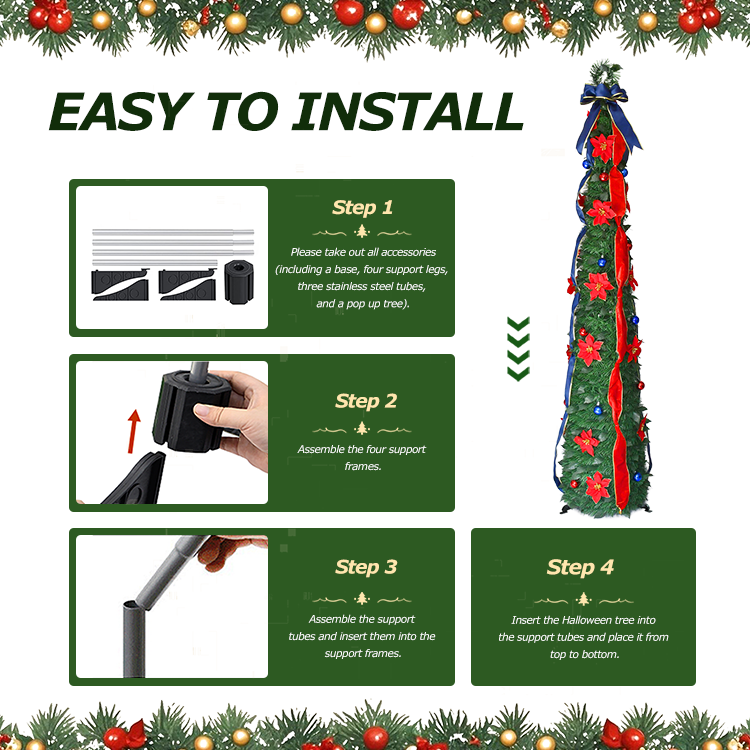 Árbol de Navidad Plegable y Telescópico que Crea un Ambiente Festivo de Invierno con Cintas Rojas y Decoraciones de Madera de Palisandro