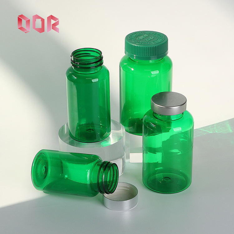 Cápsulas de PET verde de grado alimenticio, suplemento de tableta de 150ml, botella de plástico para el cuidado de la salud con color personalizado, tapa CRC, tapa metálica