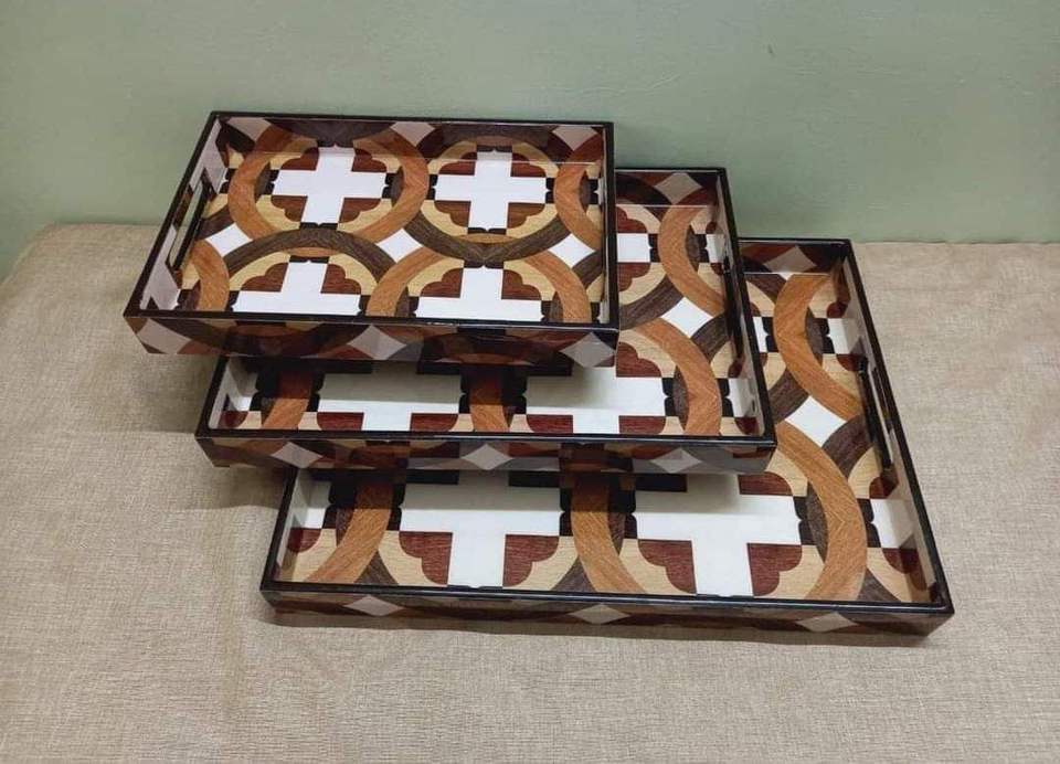 Juego de bandeja de servicio de MDF de grado alimenticio de 3 piezas con diseño impreso de esmalte Bandeja usada de utensilios de cocina para restaurante y hogar de calidad premium