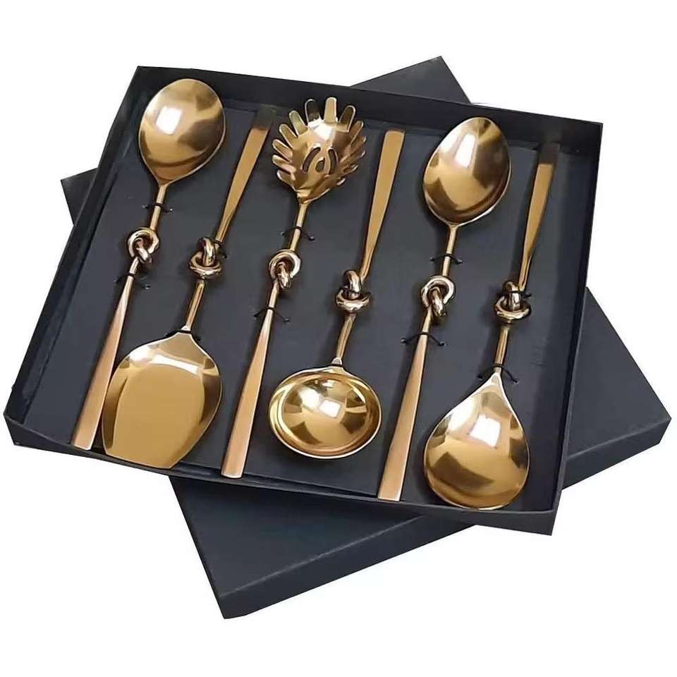 Juego de utensilios para servir alimentos con mango de vástago Delgado dorado en una caja de regalo Accesorios de cocina Utensilios de grado alimenticio