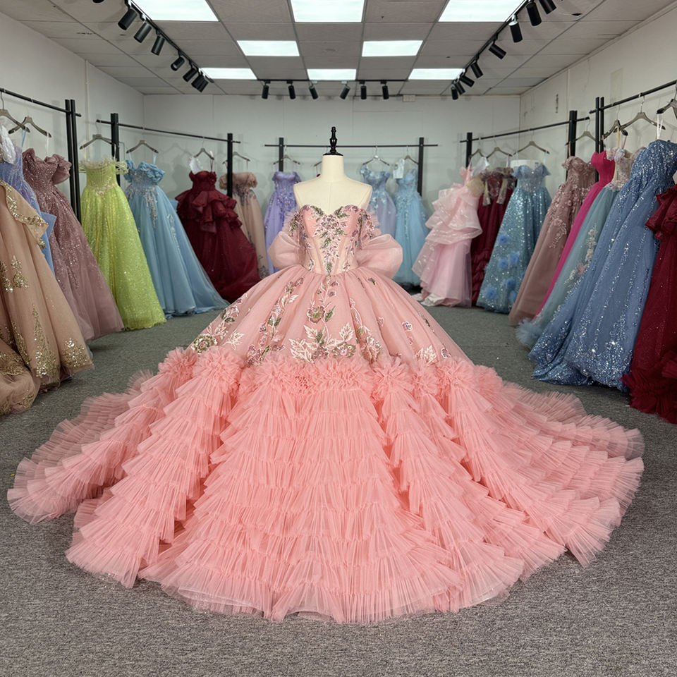 Vestido de Quinceañera Exclusivo 6961 Rosa con Volantes, Corte Imperio, Cintura Natural, Apliques de Lazo y Bordados