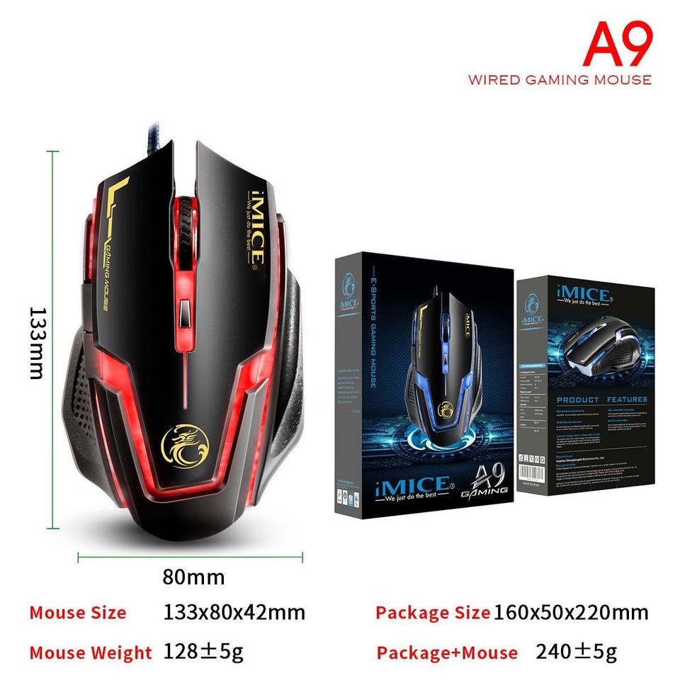 Ratón Óptico con Cable para Juegos A9, Retroiluminación RGB, 7 Botones, DPI3200, USB, Ergonómico para Diestros, para Carreras, en Stock