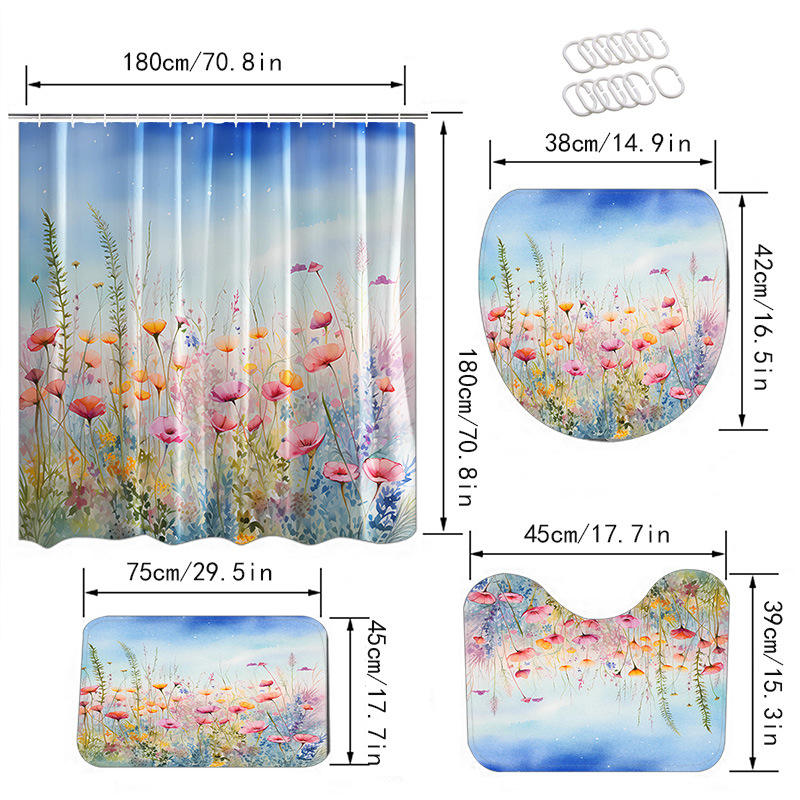 Juego de cortinas de baño de cuatro piezas superventas de Amazon, cortina de ducha impermeable de poliéster con estampado de pradera de flores silvestres de acuarela