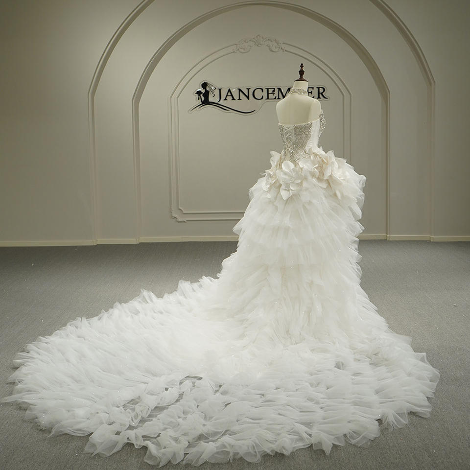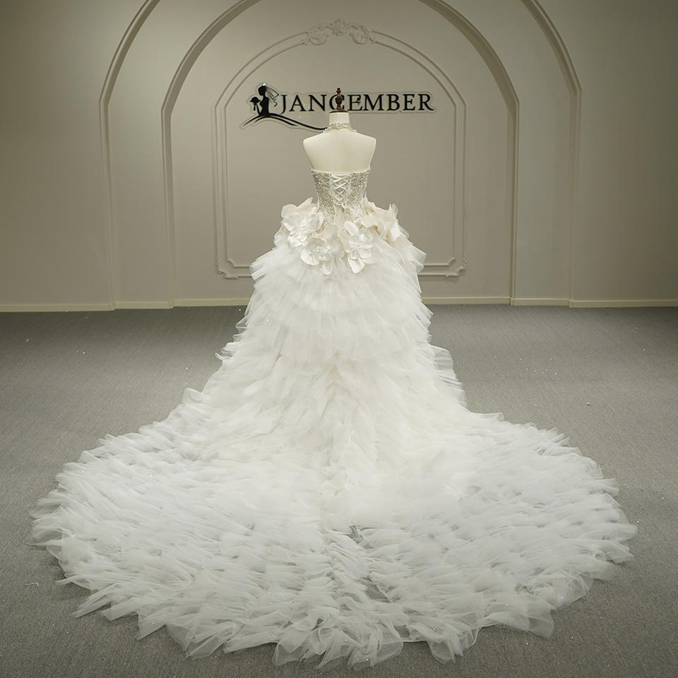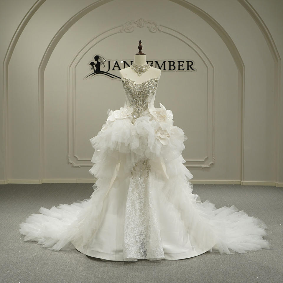 Vestido de Novia Moderno Estilo Sirena con Volantes y Flores, Modelo GT26043, con Cola de Capilla, Decoraciones de Encaje y Cristales, y Sobrevestido