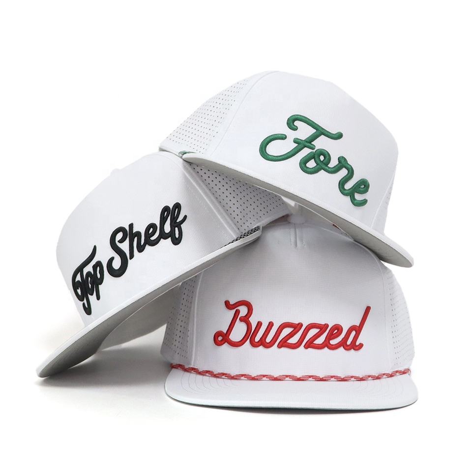 Gorra de Golf para Hombre, Personalizada, Blanca, de 5 Paneles, con Logotipo Bordado, Perforaciones Cortadas con Láser, Visera Plana, Secado Rápido, Cierre a Presión, Venta al Por Mayor