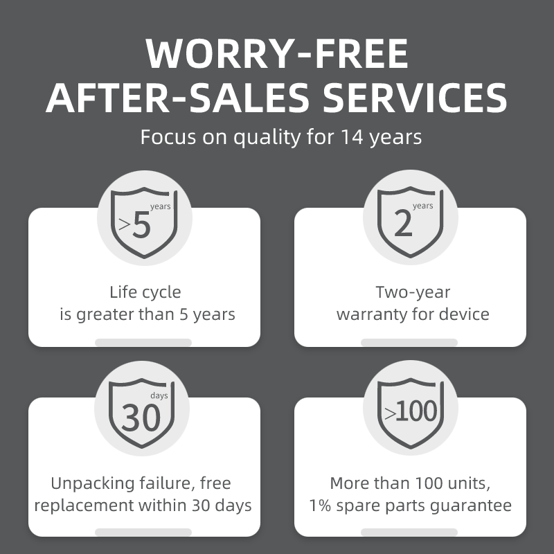 Servicio post-venta:Centro de llamadas y en línea de apoyo técnico, La capacitación en el lugar de inspección y, repuestos gratis, Devolución y reemplazo, Reparación