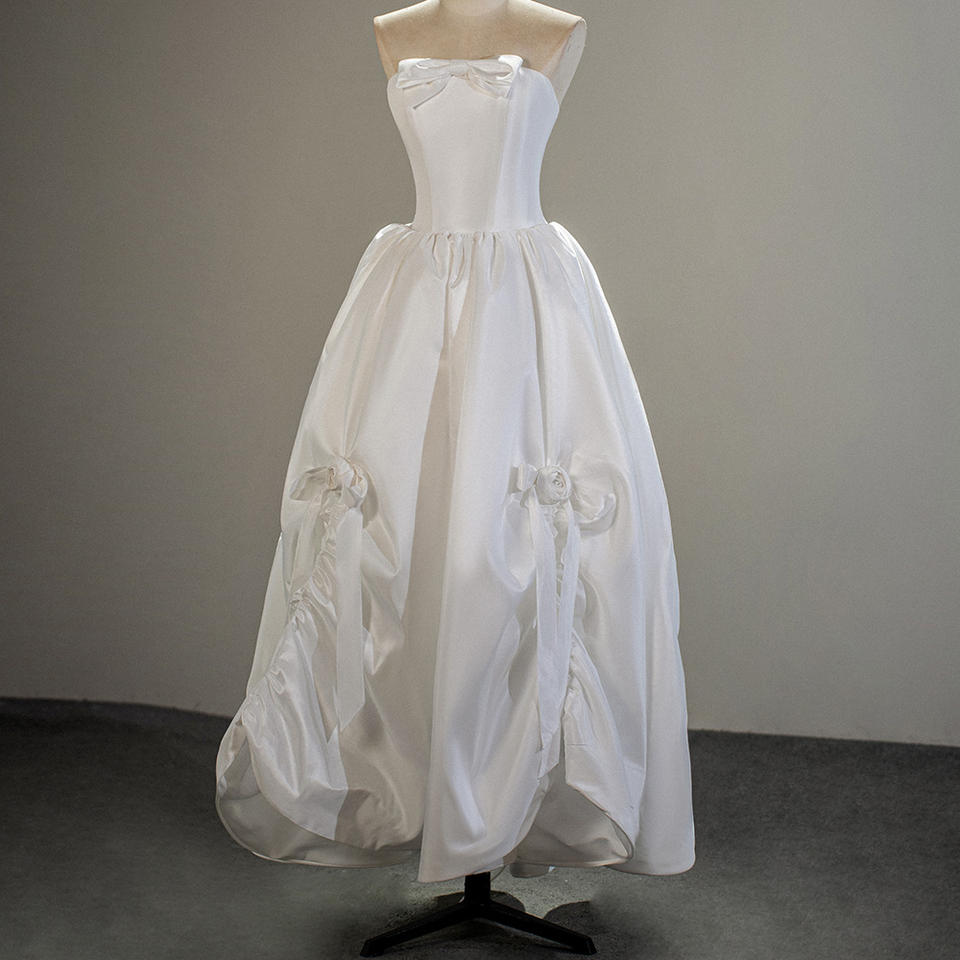 Vestido de Novia SFY212 Elegante, Sin Tirantes, con Lazo, de Satén, Estilo Organza, Línea A, Cola de Capilla, Largo hasta el Suelo, con Volantes y Pliegues, Estilo Natural para Fiesta