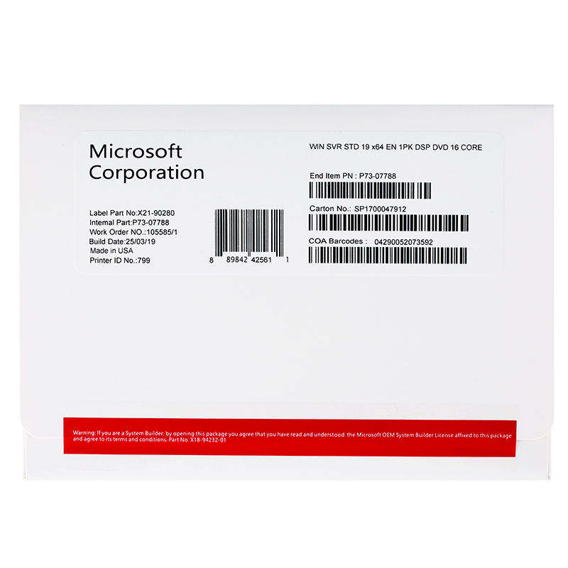 Para Windows Server 2019 Sistema operativo de versión empresarial de activación de DVD estándar con disponibilidad de stock