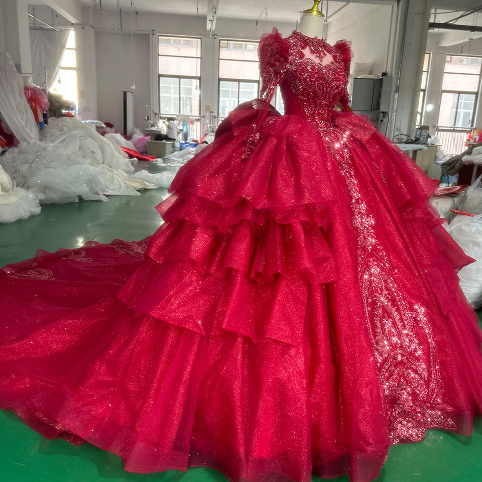 Jancember XS086 Classic Red High Neck Puffy Vestidos largos de noche para mujer