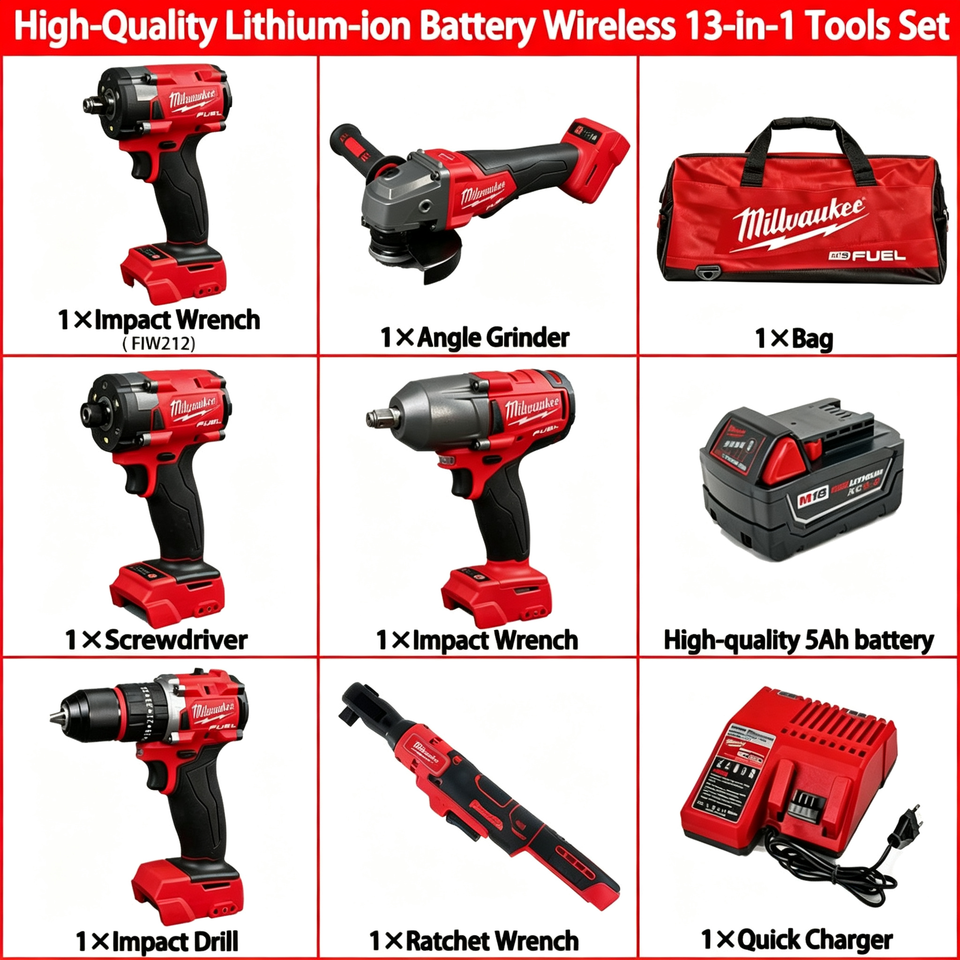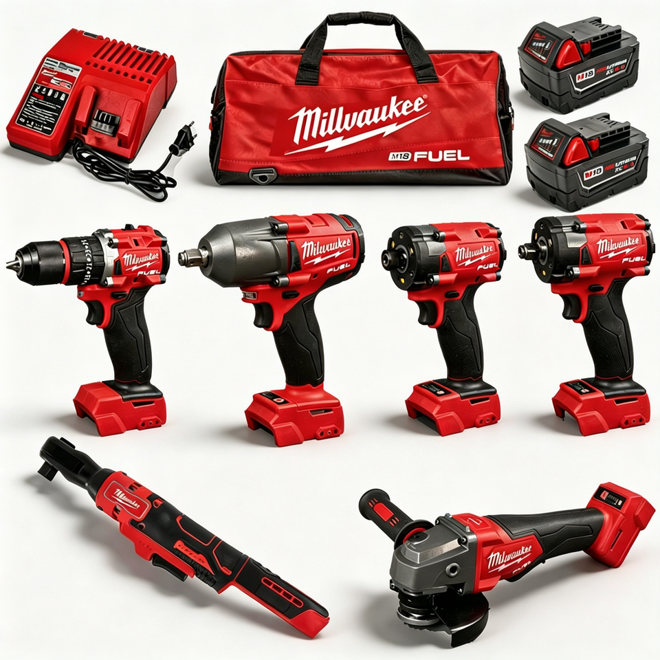Juego de Herramientas Eléctricas OEM que Incluye Llave de Impacto, Llave de Trinquete, Amoladora Angular, 2 Baterías y Cargador