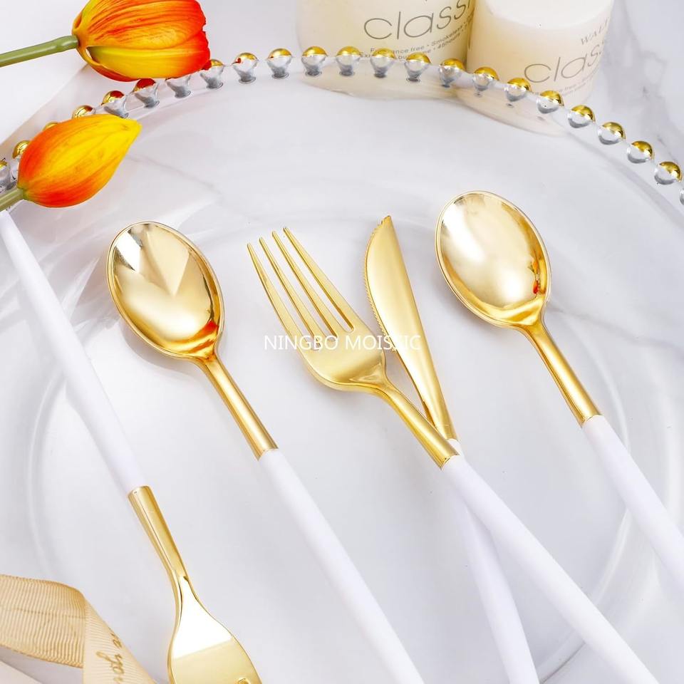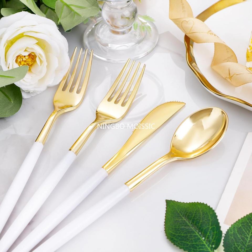 Juego de Cubiertos de Plástico Blanco con Mango Negro y Detalles Dorados para Regalos Empresariales