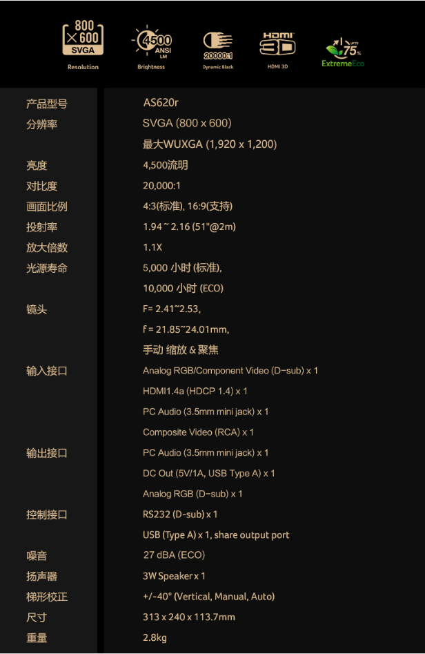 Throw Ratio:1.94~2.16(51"@2m)